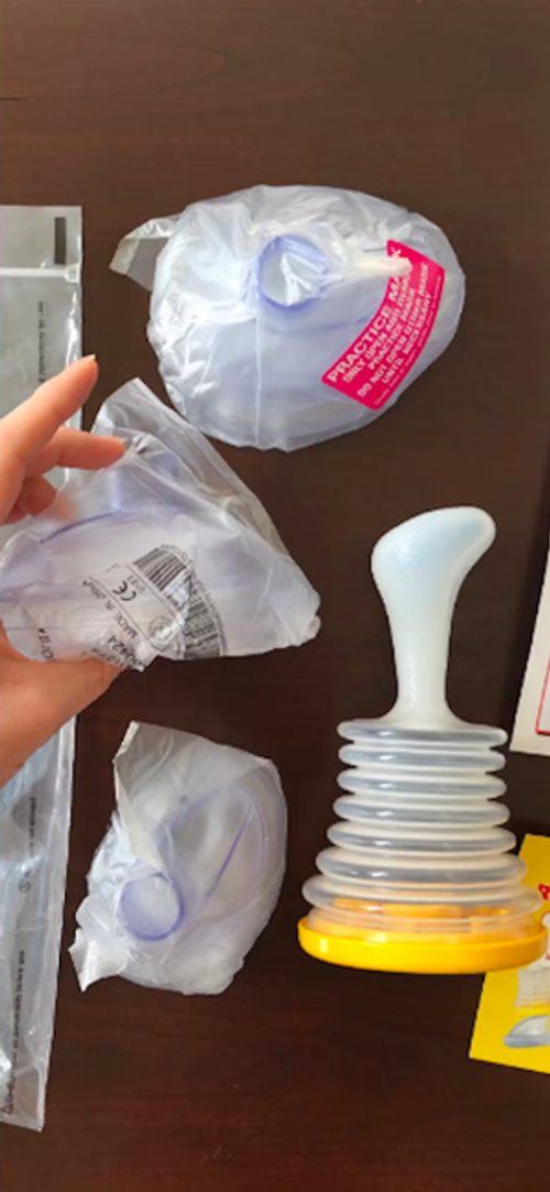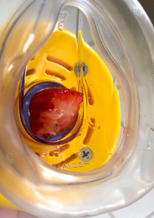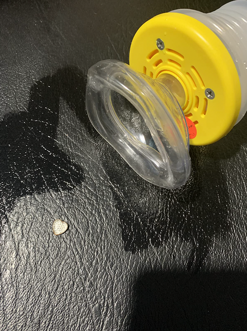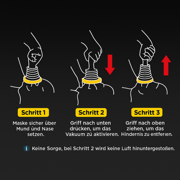 Drücke den Griff des AirGuard zuerst kräftig nach unten, um das Vakuum-System vorzubereiten. Anschließend ziehst du den Griff nach oben, um das festsitzende Objekt sicher aus den Atemwegen zu entfernen. Keine Sorge: Dabei wird keine Luft hinuntergestoßen, sondern nur das schädliche Objekt herausgesogen, was die Gefahr einer weiteren Blockade vermeidet.