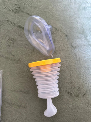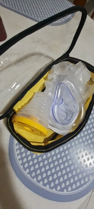 Der AirGuard wird mit zwei Masken geliefert – eine für Kinder und eine für Erwachsene. Wähle die richtige Maske entsprechend der betroffenen Person und setze sie fest über Mund und Nase.