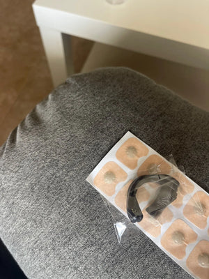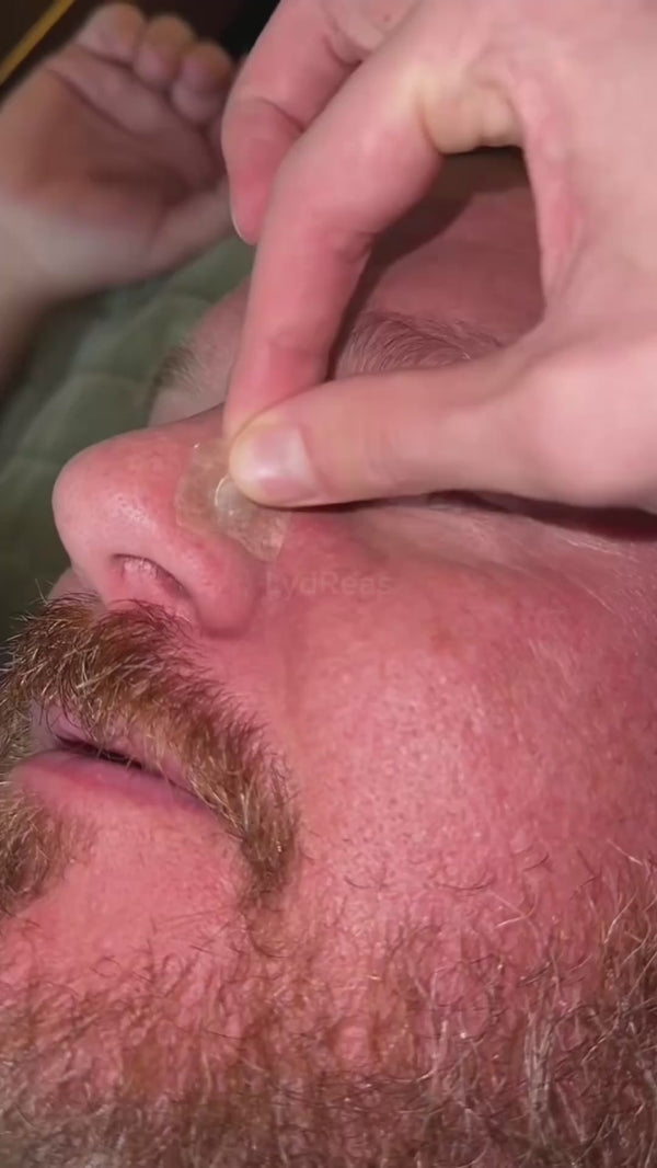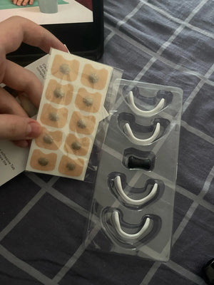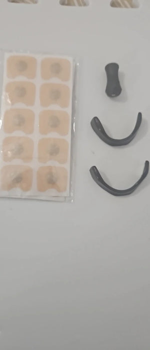 Reinige und trockne die Nase, klebe die Tabs auf die Nasenflügel und setze den Bügel auf. Danach kurz feinjustieren, bis es angenehm sitzt.