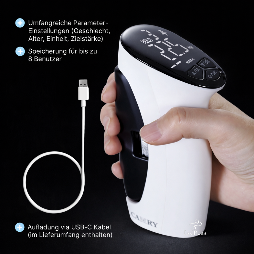 Griplex erfasst die aufgebrachte Kraft digital und zeigt sie in klaren Zahlen an. Die Messung dient dazu, Veränderungen und Trends deiner Griffkraft objektiv nachzuvollziehen – nicht zur medizinischen Diagnose.